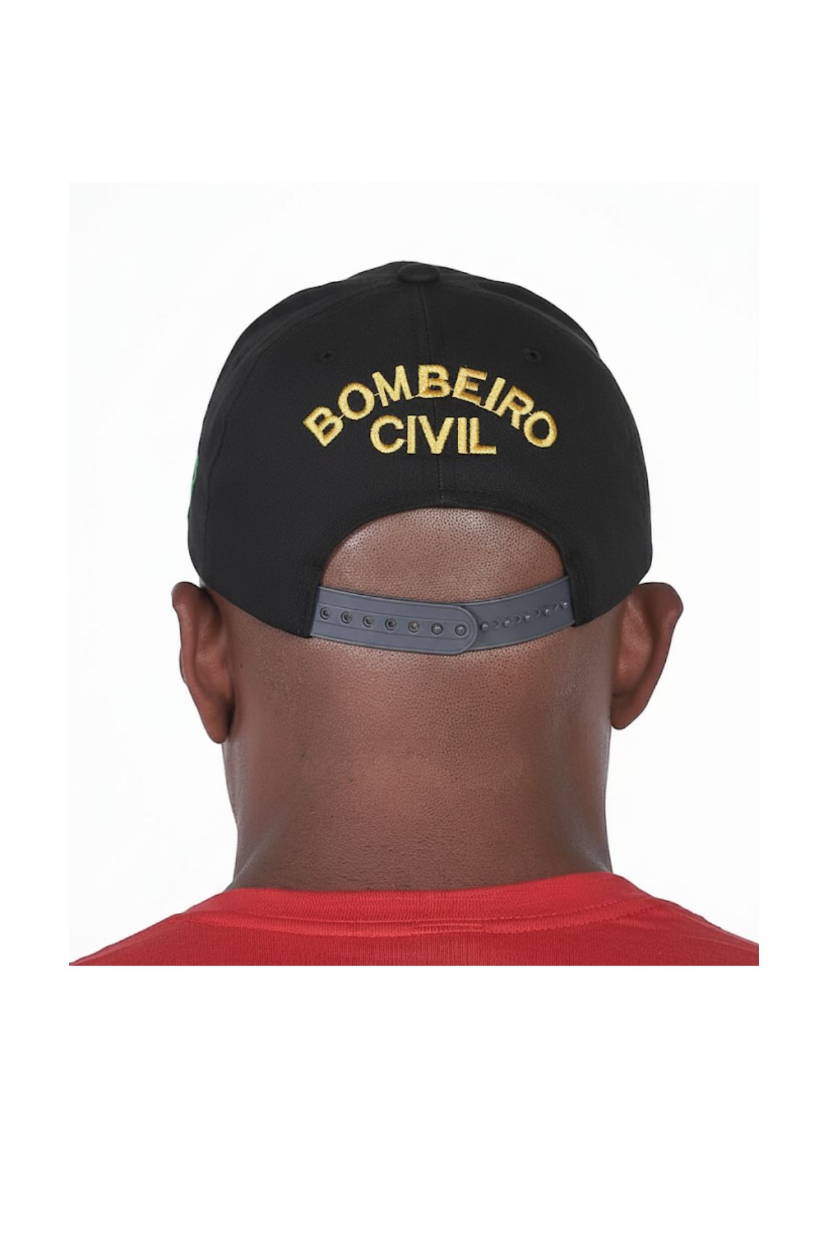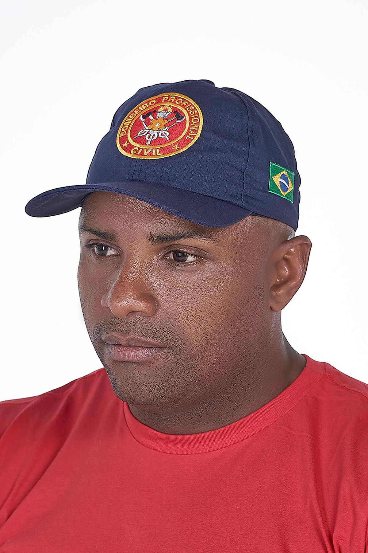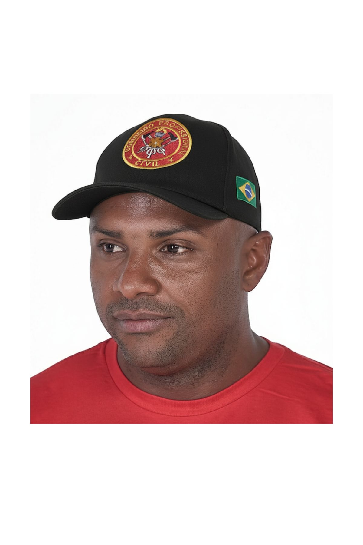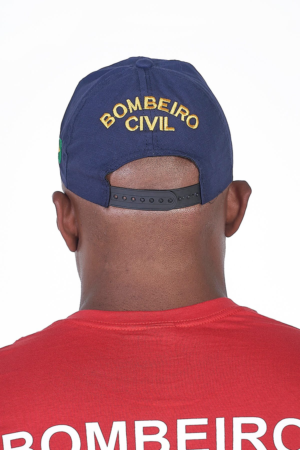 Apresenta o brasão Bombeiro Profissional Civil bordado na frente, a bandeira do Brasil bordada na lateral esquerda e a inscrição “Bombeiro Civil” bordada atrás, acima do fecho.