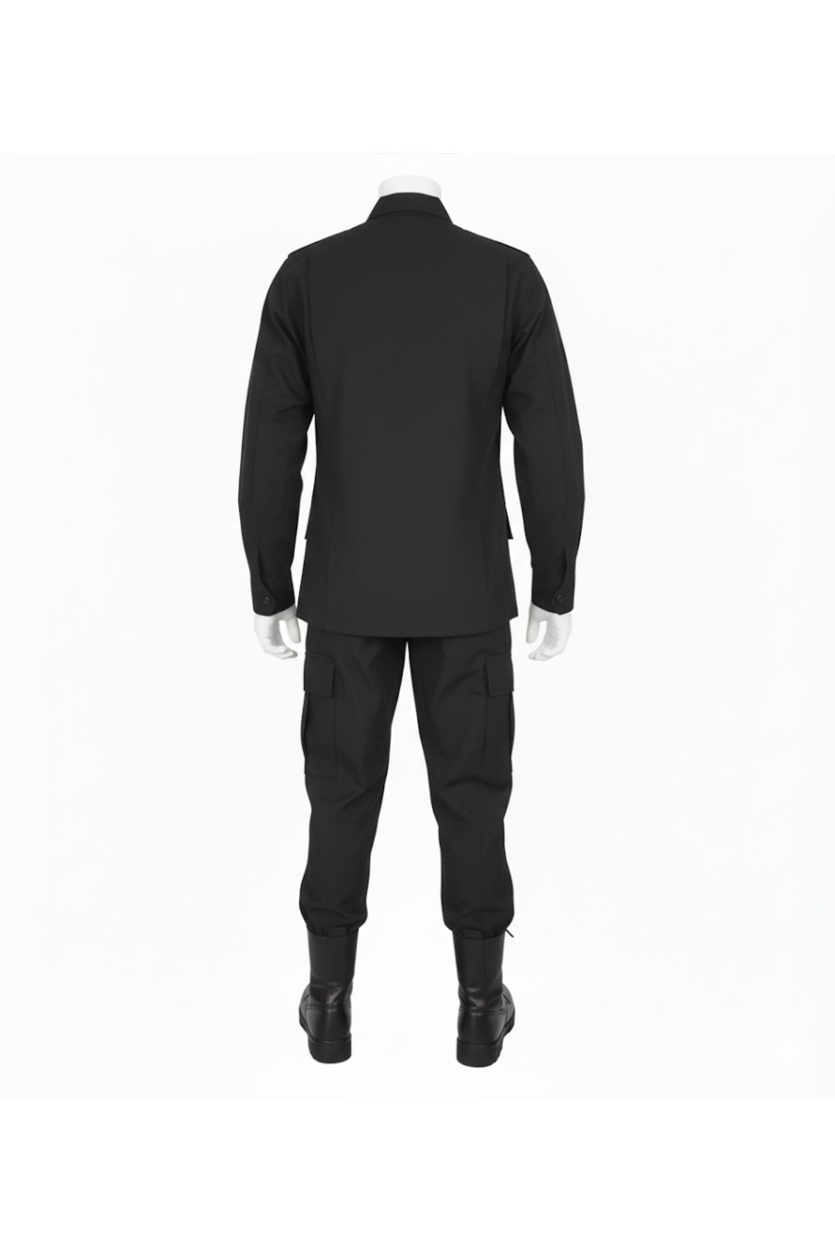 Introduzimos a Farda Tática em Preta, confeccionada em RipStop com uma composição robusta de 67% algodão e 33% poliéster. Este conjunto, composto por Gandola Tática Preta e Calça Tática Preta, oferece um visual clássico e funcionalidade duradoura.
