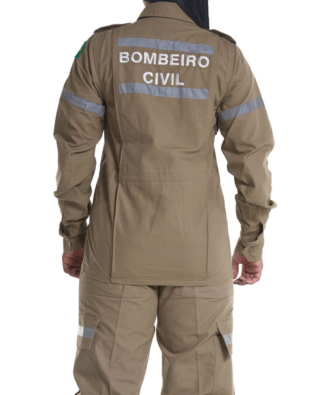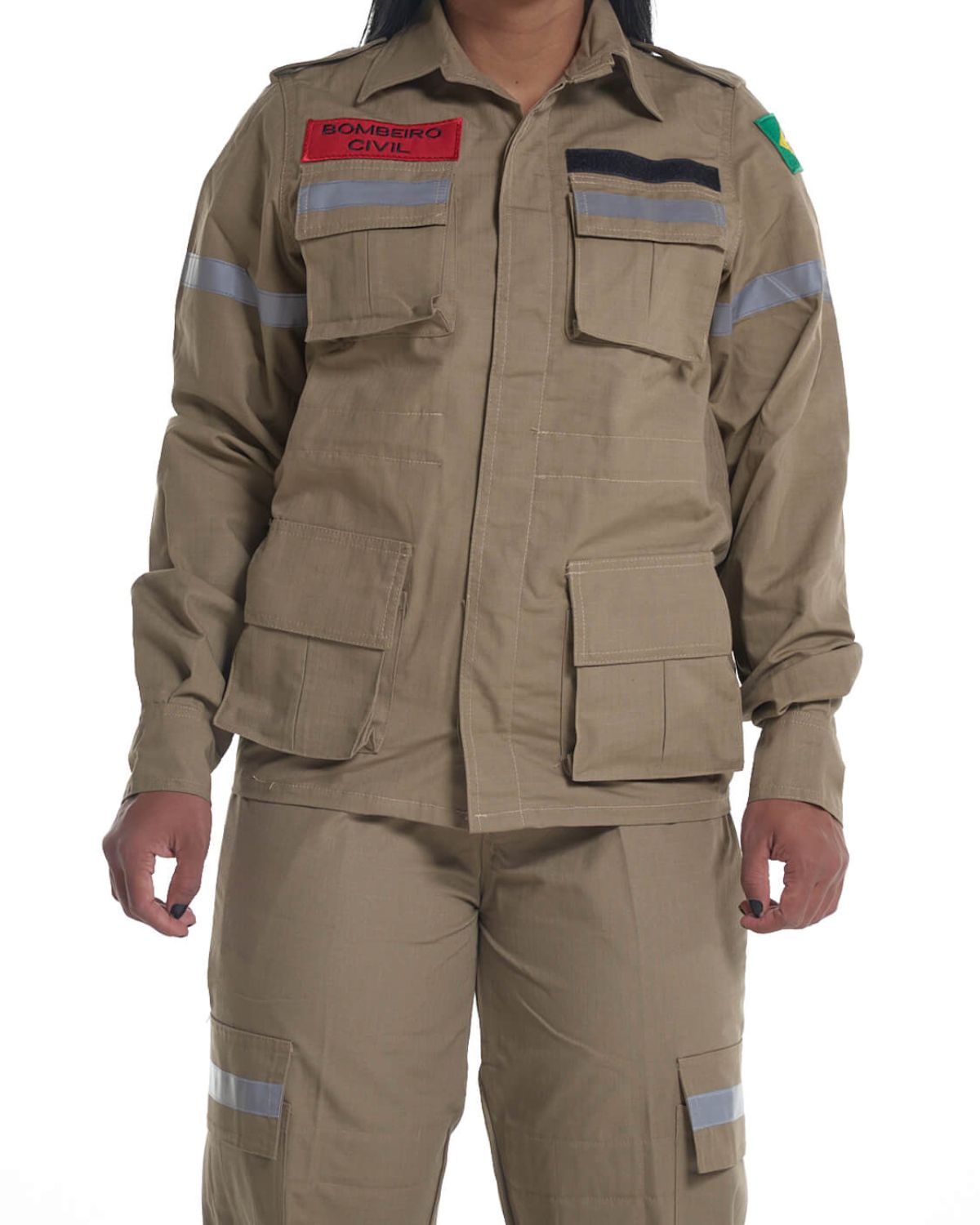 Bordado “Bombeiro Civil” na frente e nas costas, facilitando a identificação da função.